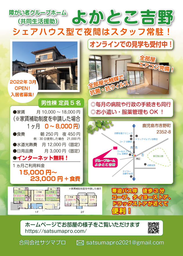 「障がい者グループホーム よかとこ吉野」 鹿児島市吉野町に、2022年3月にオープンしました。 よかとこ吉野は、夜間もスタッフ常駐のシェアハウス型グループホームです。 私たちの「本当の意味でのバリアフリーな環境を作りたい!」という想いから始まりました。 住み慣れた地域で安心して快適に暮らして頂けるよう、一人ひとりの個性や想いに寄り添ったサポートをしてまいります。 吉野町の帯迫バス停まで徒歩 3 分。 コープ、タイヨーストア、ドラッグストアが近くて便利です! <男性棟 定員5名> ●家賃/月 10,000 ~ 18,000 円 (※家賃補助制度を申請した場合/月 0 ~ 8,000 円) ●食費 朝 250 円 夜 450 円 (例: 30 日使用した場合 21,000 円) ●水道光熱費/月 12,000 円(固定) ●日用品費/月 3,000 円(固定) ●インターネット/無料 ●全部屋 エアコン完備 ●全部屋光触媒で 抗菌・抗ウィルス対応 1 ヵ月ご利用料金/15,000 円~ 23,000 円 + 食費 ※家賃補助制度を申請した場合 見学、体験入居のお申込み・お問合わせはコチラまで。 お気軽にお問合わせください。 合同会社サツマプロ メール:satsumapro2021@gmail.com 090-3074-3991 担当:竹原